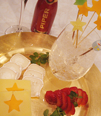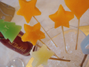型を抜いたチェダーは、竹串に差し、透明のマジッククリスタル※を入れたグラスに高さを変えて差します。