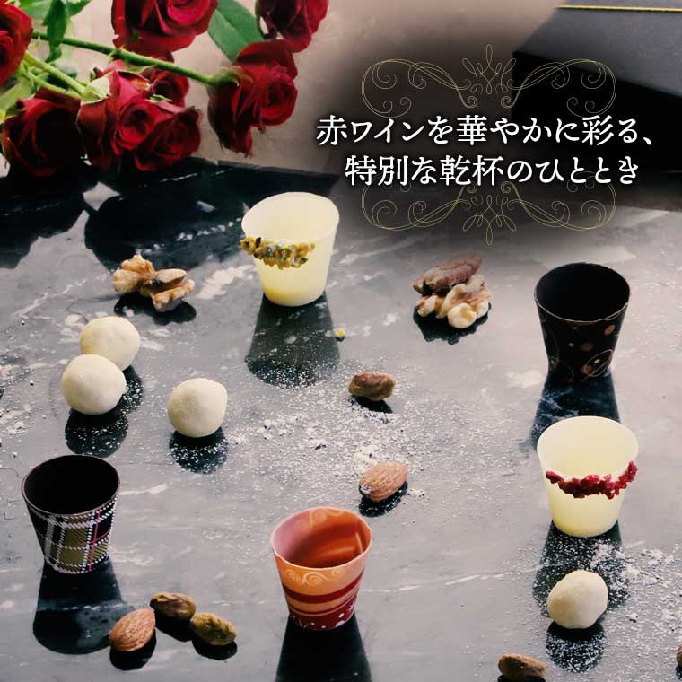 ショコラでできたグラスにワインを注げば、その香りと味わいの華やかなマリアージュを楽しめる、