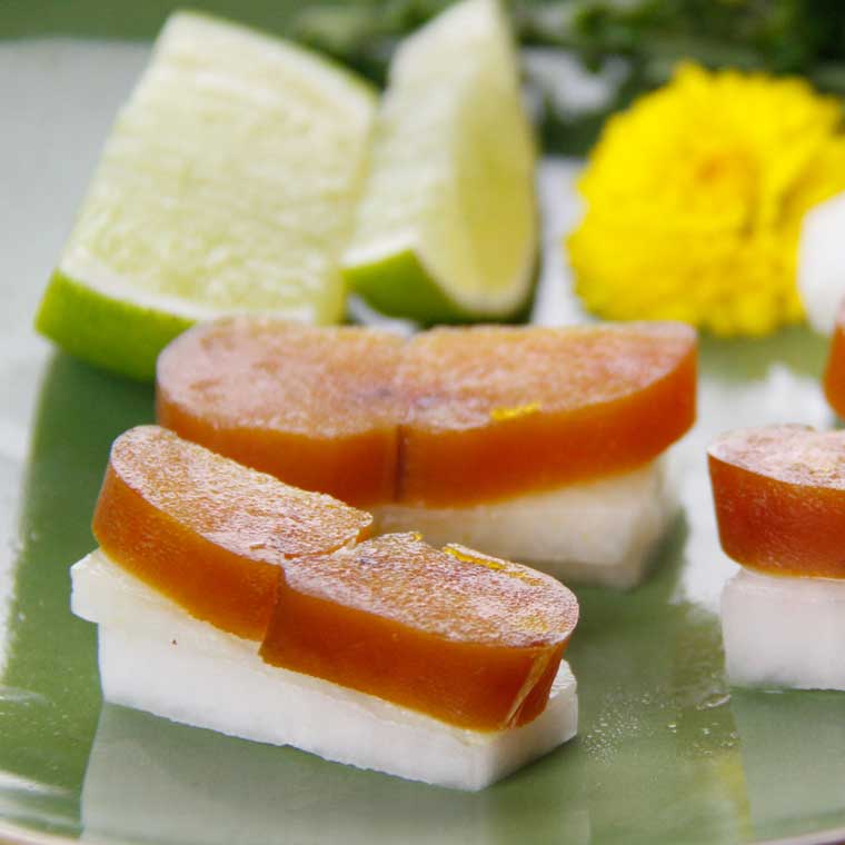 カラスミは、大根と相性抜群! 同じ大きさにカットしてお楽しみください。 少量のレモンで爽やかな酸味を加えても◎。 大根のシャキシャキ感とねっとりしたカラスミの食感が楽しい一皿です。