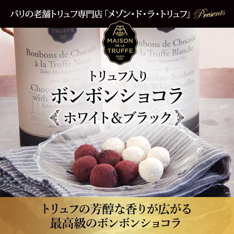 白トリュフ入りボンボンショコラ<ホワイト>と黒トリュフ入りボンボンショコラ<ブラック>!