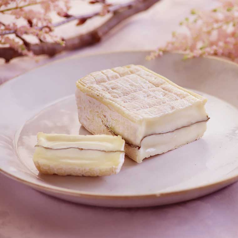 可愛らしいレンガ型のシェーブルチーズの中に、日本の桜の葉が挟まれた