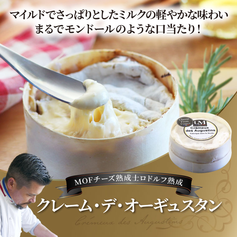 MOFロドルフ・ムニエ氏によって熟成され、もっちりとした食感とさっぱりとしたミルクの味わいが特徴の『クレーム・デ・オーギュスタン』。可愛らしい木箱入りの同チーズの周りにはモンドールと同様にエピセア(トウヒ属の針葉樹)が巻かれています。