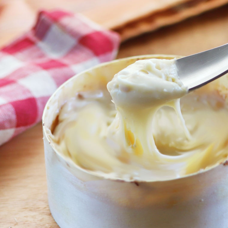 食べ方としても「モンドールAOP」と同様、まずチーズを木箱から出さずに周囲に沿ってナイフを入れ、表面の表皮を取り除きます。中の柔らかい部分をスプーンでかき混ぜるととろみが増し、クラッカーやクルミ入りのパン、バゲットにたっぷりと塗り食すのがおすすめです。