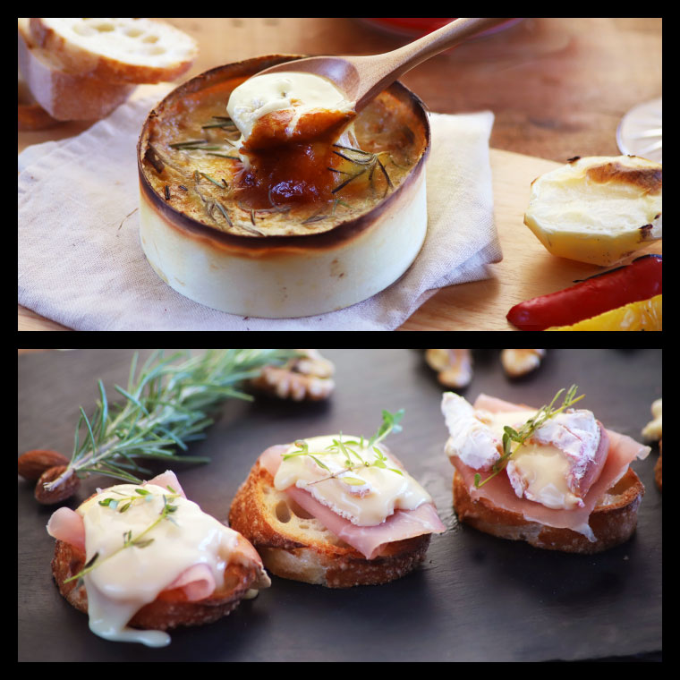 チーズをオーブンで温めて上の表皮をくり抜けばチーズポットの出来上がり。スプーンですくってそのままパクっと召し上がっていただけますし、くるみ入りのパンやソーセージ、ほくほくのジャガイモにつけていただくなど、おいしい組み合わせはたくさん!