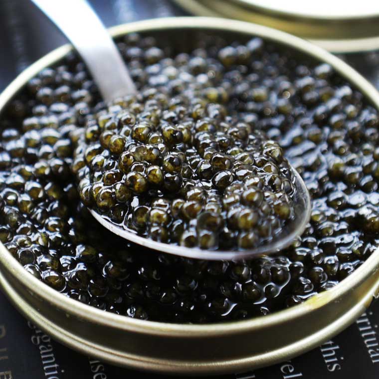 脂質があり、味わいは濃厚。繊細でやわらかく、ほどけるような舌ざわりが特徴です。キャビアの色はグレーがかっており、色が明るいほど良いとされています。