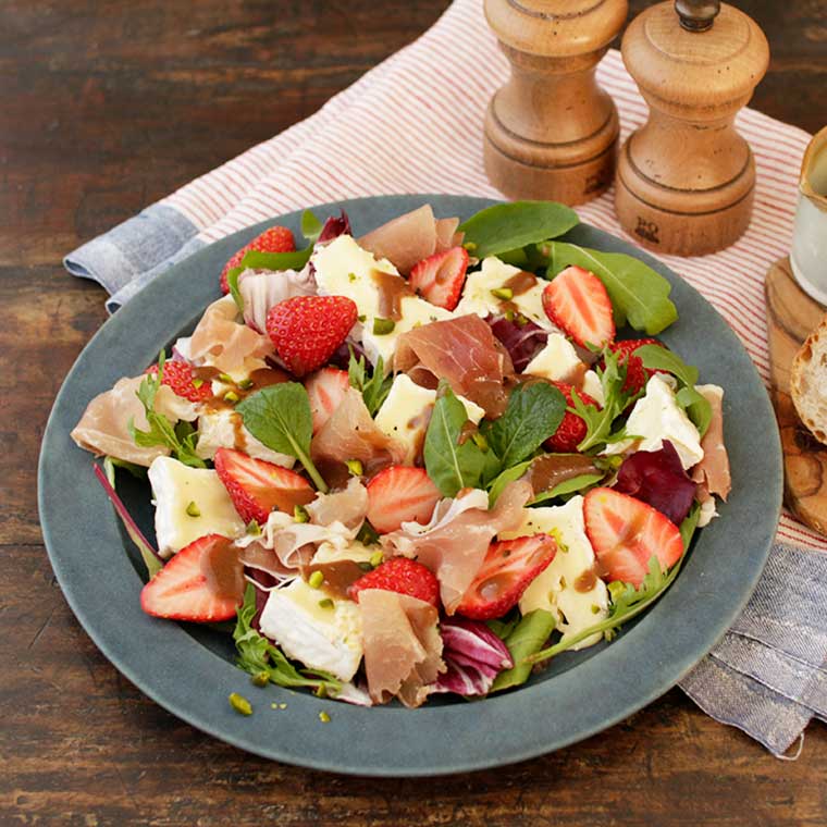 いちごのコンフィチュールとバルサミコのソースの甘酸っぱさが素材のおいしさを引き立てます。パンと一緒にお召し上がりください。
