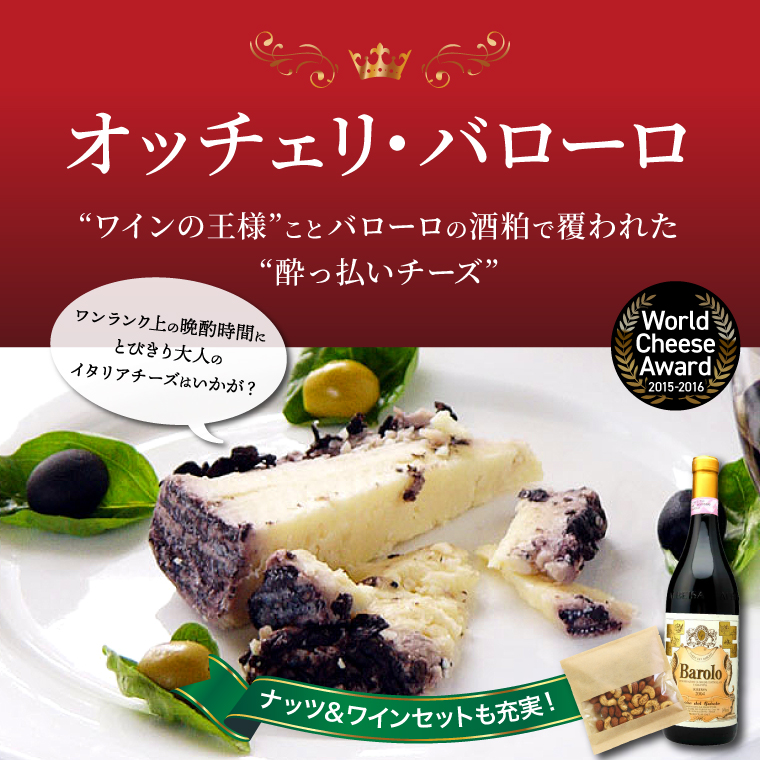 「オッチェリ・バローロ」は、1999年に「スローフード協会」から、“酒飲みチーズ”というありがたい称号を受けているほど、お酒との相性の良いチーズでもあります。味わいも王様級のバローロワインに合わせるにも最適ですね!