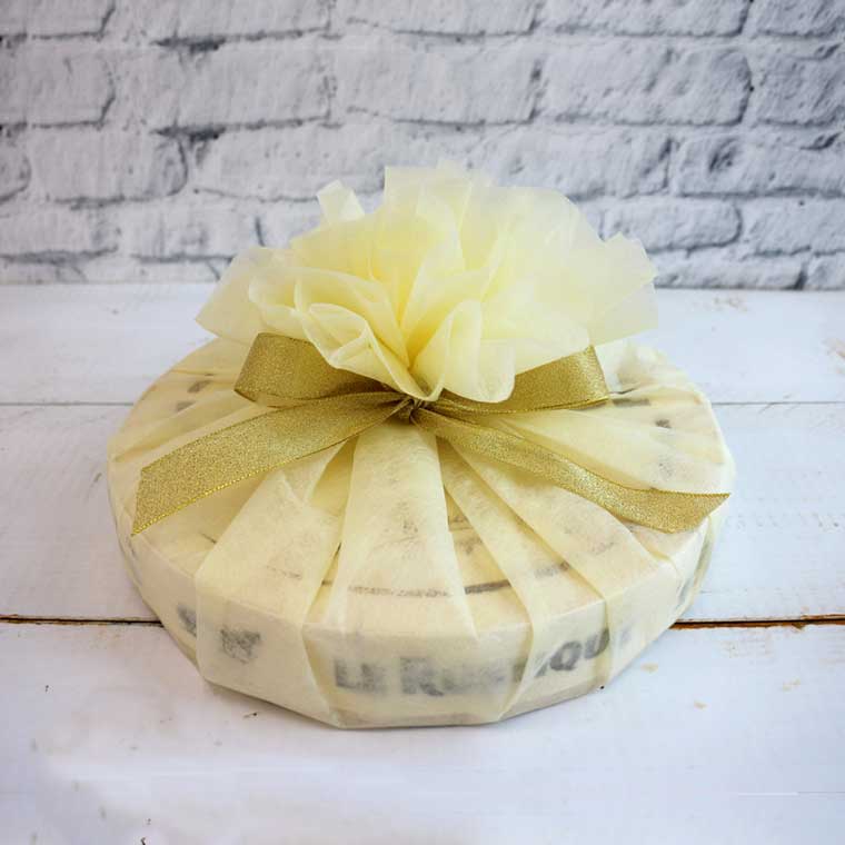 今回、オシャレな木箱入りのル・ルスティックブリーを、アイボリーの包装紙とゴールドのリボンでラッピングしました。ギフトにぴったりの上品なラッピングは、喜ばれること間違いなしです!