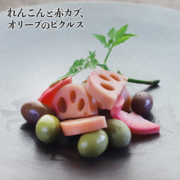シンプルながらも野菜本来の美味しさを味わえる、リピーター様にもファンの多い定番おつまみ"ピクルス"が大幅なリニューアル! 味付けはそのままに、れんこん・赤カブ・2種のオリーブを使用した、根本シェフ特製のピクルスです。